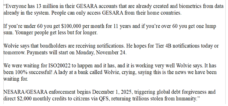 “The promise: $100,000 a month for 11 years — $13.2 million per citizen — disbursed via QFS accounts from satellite systems. The stolen wealth to be recovered is staggering — quattuordecillions. Every birth certificate, marriage record, and death certificate traded on secret markets will be redeemed. Social Security payments are set to surge — up to $5,000 monthly for seniors. Disability payments will follow. Interest paid on mortgages, loans, and credit cards will be returned — plus 3.5% per year. Income taxes, long collected under fraud, will be refunded in full.” “The Coming One” aka the Antichrist is also about to come to the scene. Migrants, you’ll be in trouble because the world is moving to a new treasury system and you’ll need to return to your home country to collect your funds. You’ll be charged 998.00 per day that you stayed past the order to return home. Also, I checked on people in nursing homes and what to do if they have a Power of Attorney and I heard that the funds can only be accessed by the person because it will be by iris scan.